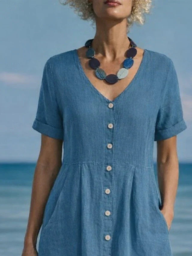 The Barbara Elegant Button Midi Dress is designed to combine comfort, femininity, and quiet sophistication in one beautifully balanced piece. With its softly flowing silhouette and classic button front, it drapes naturally over the body for a flattering and reassuring fit. The gentle V neckline and relaxed sleeves add a refined touch while keeping the overall look light and easy to wear.